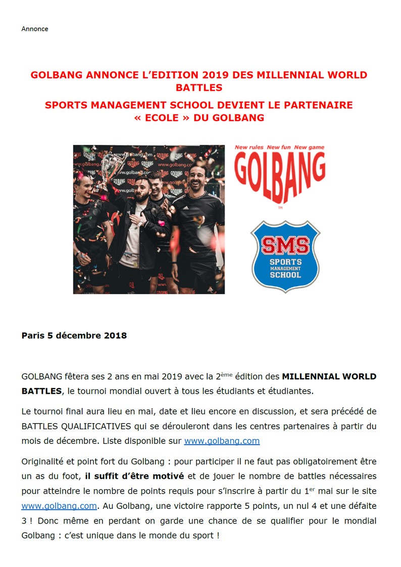 Sports Management School rejoint le Golbang et devient partenaire des MILLENNIAL WORLD BATTLES 2019. Une belle opportunité pour motiver tous les étudiants et étudiantes des campus de Paris, Lausanne et Barcelone à JOUER, PARTICIPER et pourquoi pas GAGNER l'un des 8 trophées mis en jeu en mai 2019 !