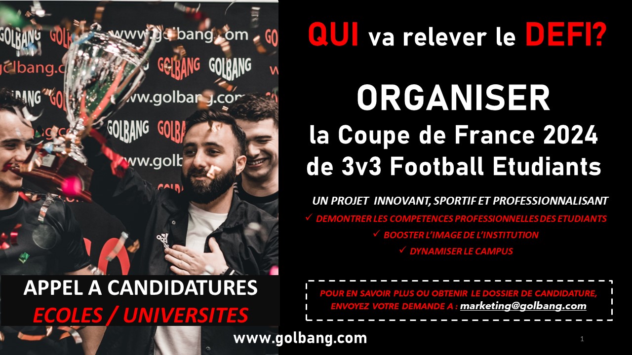 Golbang innove encore ! Cette fois nous proposons aux étudiants et étudiantes en management sportif des écoles et universités d'organiser un événement national ouvert à tous les étudiants et étudiantes: La 1ère Coupe de France de 3v3 Football pour les étudiants !