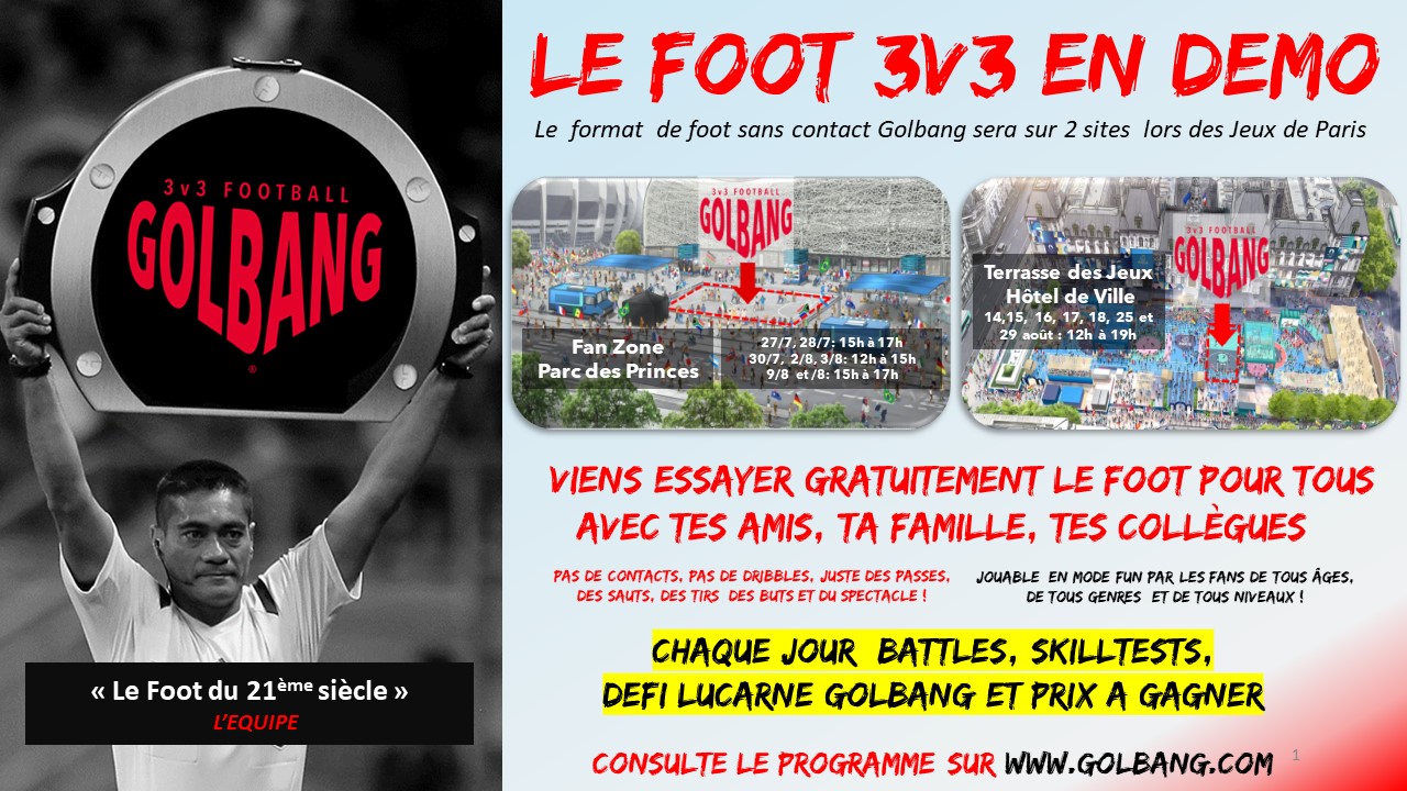 Le Golbang 3v3 football sera présent sur 2 Fan Zones cet été pour permettre aux Parisiens et Parisiennes, aux touristes, aux associations, aux clubs, aux entreprises de pratiquer le foot en mode 3v3, fun et sans contact.