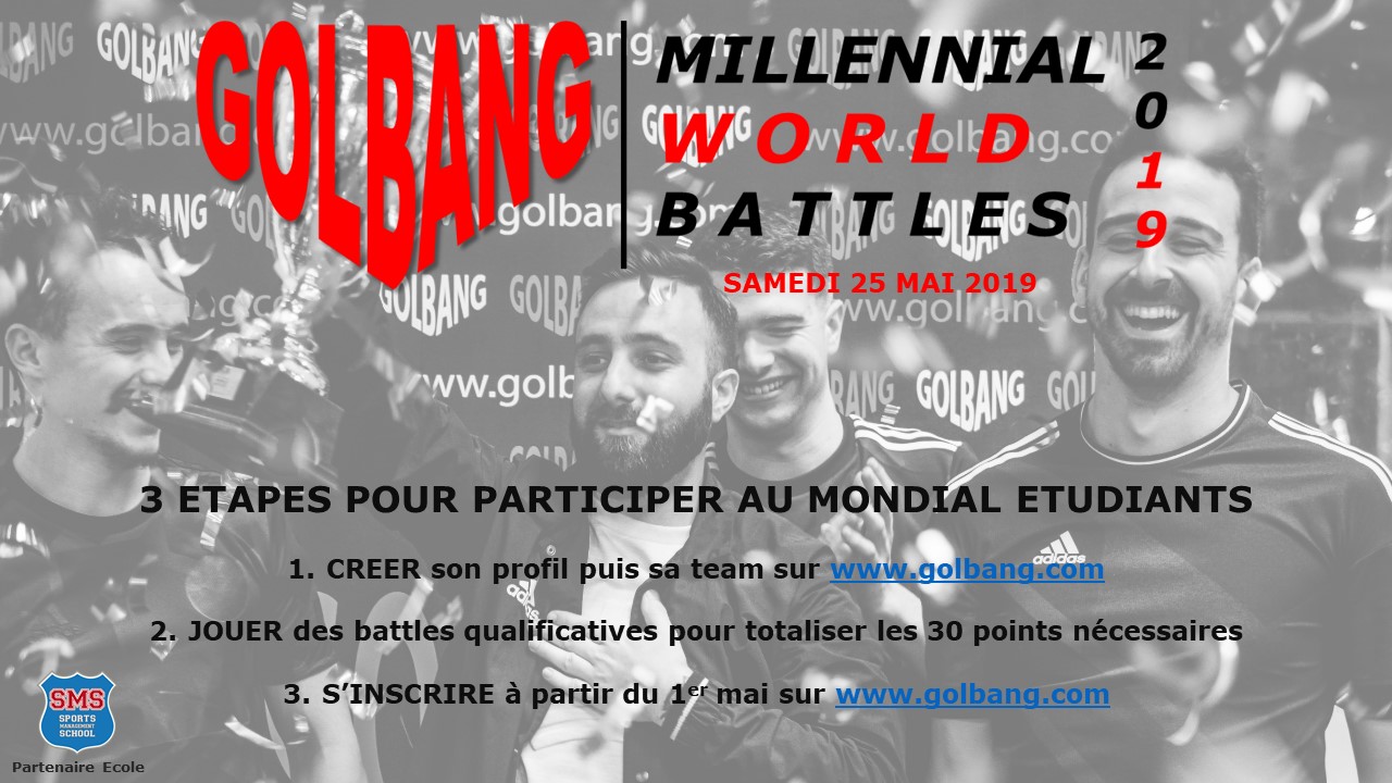 C'est officiel depuis le 5 décembre: les MILLENNIAL WORLD BATTLES 2019 auront lieu en France fin mai 2019 et seront ouverts à tous les étudiants et étudiantes. Le principe est simple et motivant car CHACUN A SA SA CHANCE DE POUVOIR S'INSCRIRE CAR IL SUFFIT DE JOUER SUFFISAMMENT POUR ACCUMULER LES POINTS NECESSAIRES ! PAS BESOIN D'ETRE UN AS DU FOOT POUR PARTICIPER A CE MONDIAL.